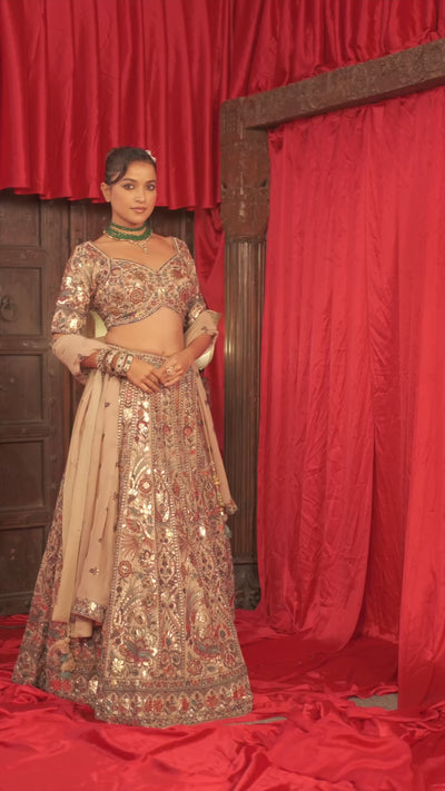 Step into timeless elegance with this regal Beige Georgette Lehenga Set, intricately embellished with resham embroidery, sequins, zari, and delicate pearl work. The flared lehenga features rich, detailed patterns, while the matching blouse complements it with equally exquisite craftsmanship. The ensemble is paired with a soft georgette dupatta in beige, perfect for weddings, receptions, or traditional festivities, this look blends grandeur with sophistication.