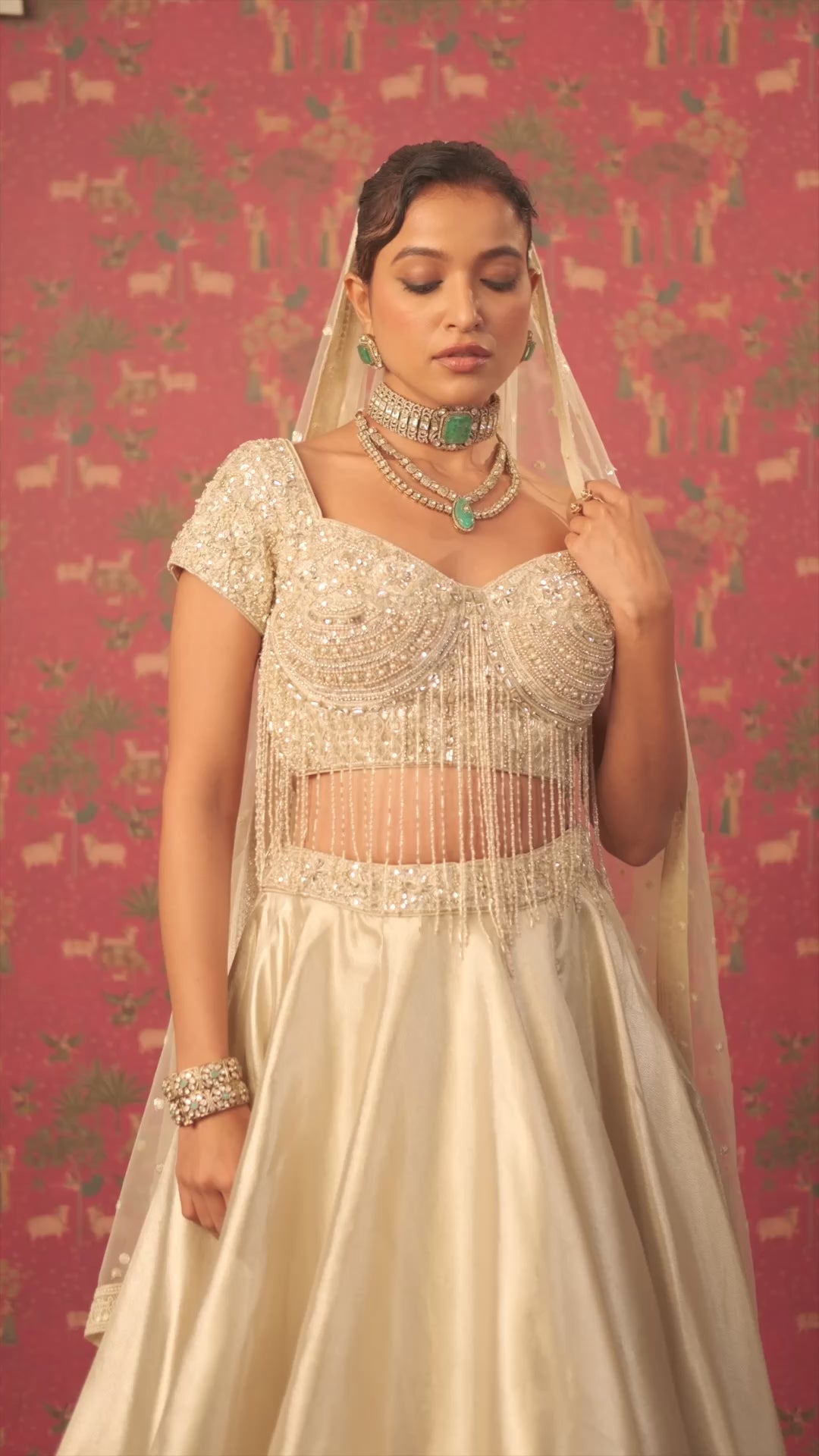 Make an unforgettable statement in the ethreal Cream Organza Lehenga Set, featuring a stunning blouse exquisite adorned with moti, cutdana, and sequin work, elevated by playful fringe detailing. The lehenga is kept minimal, with its embellished waist belt, allowing the rich fabric and silhouette to shine. Paired with a matching organza dupatta, this ensemble strikes the perfect balance between subtle charm and festive glamour, ideal for sangeets, receptions, or modern bridal looks.
