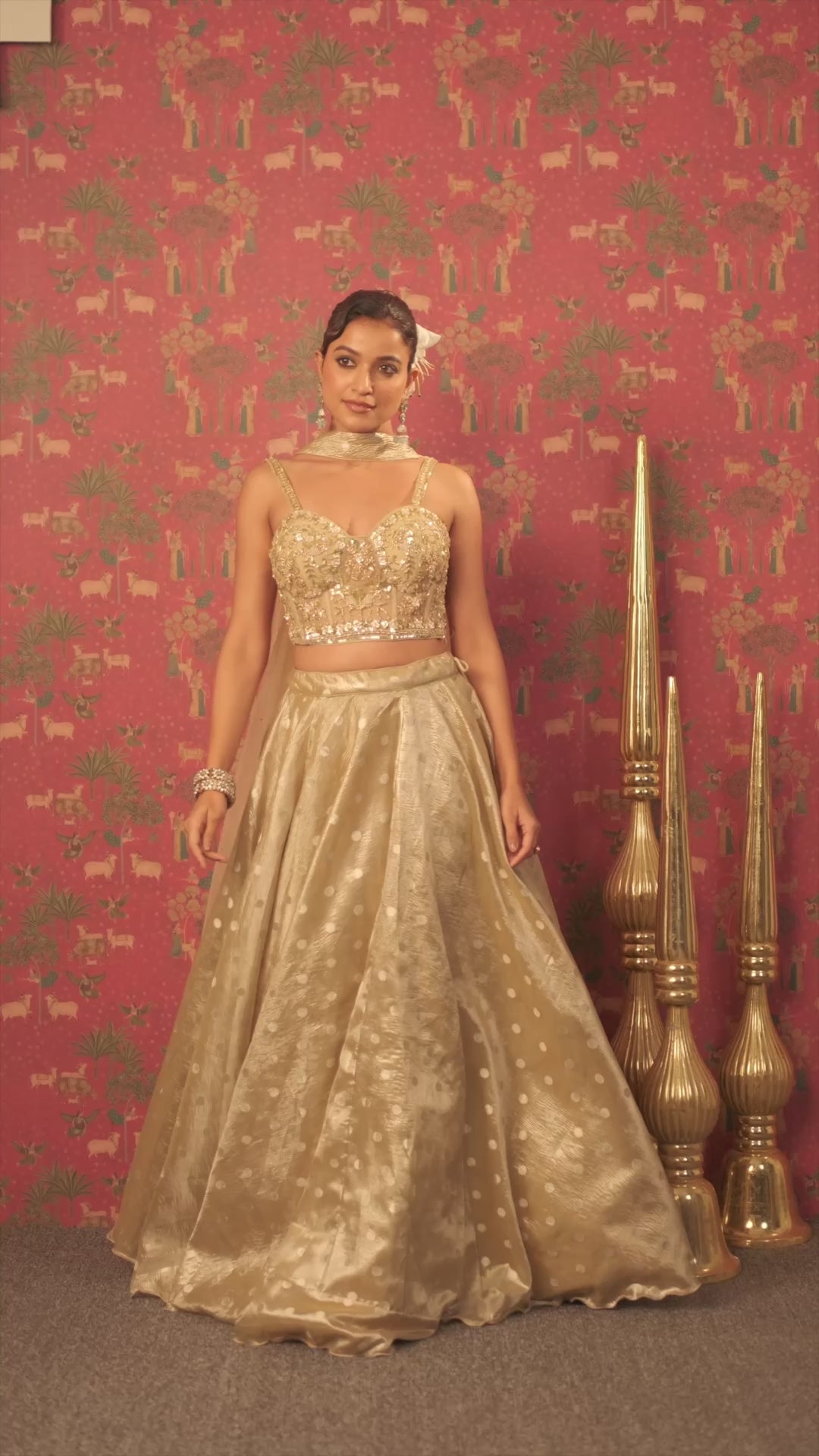 Radiate grace and glamour in this Golden Tissue Lehenga Set. The lehenga features weaving details, paired with a beautifully embellished blouse adorned with cutdana and sequins for just the right touch of shimmer. The matching tissue dupatta adds finesse, completing the look with elegance. Ideal for pre-wedding functions, cocktail nights, or festive gatherings, this ensemble is all about effortless sophistication with a hint of drama.