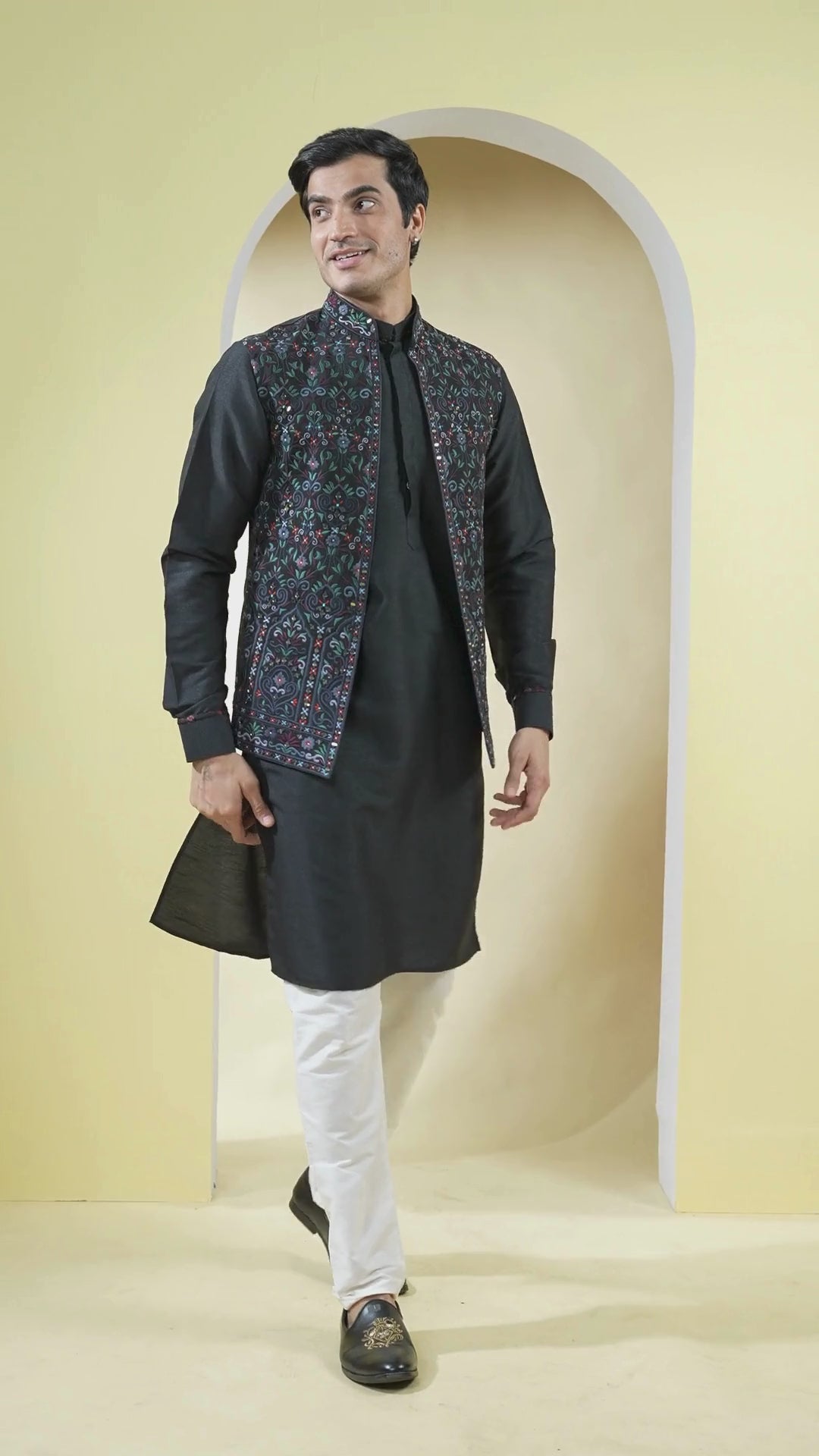 This is twilight enchantment stitched as our jet black Kurta Jacket Set embroidered with mirrors, creating a celestial masterpiece over a black and white kurta-pajama set.