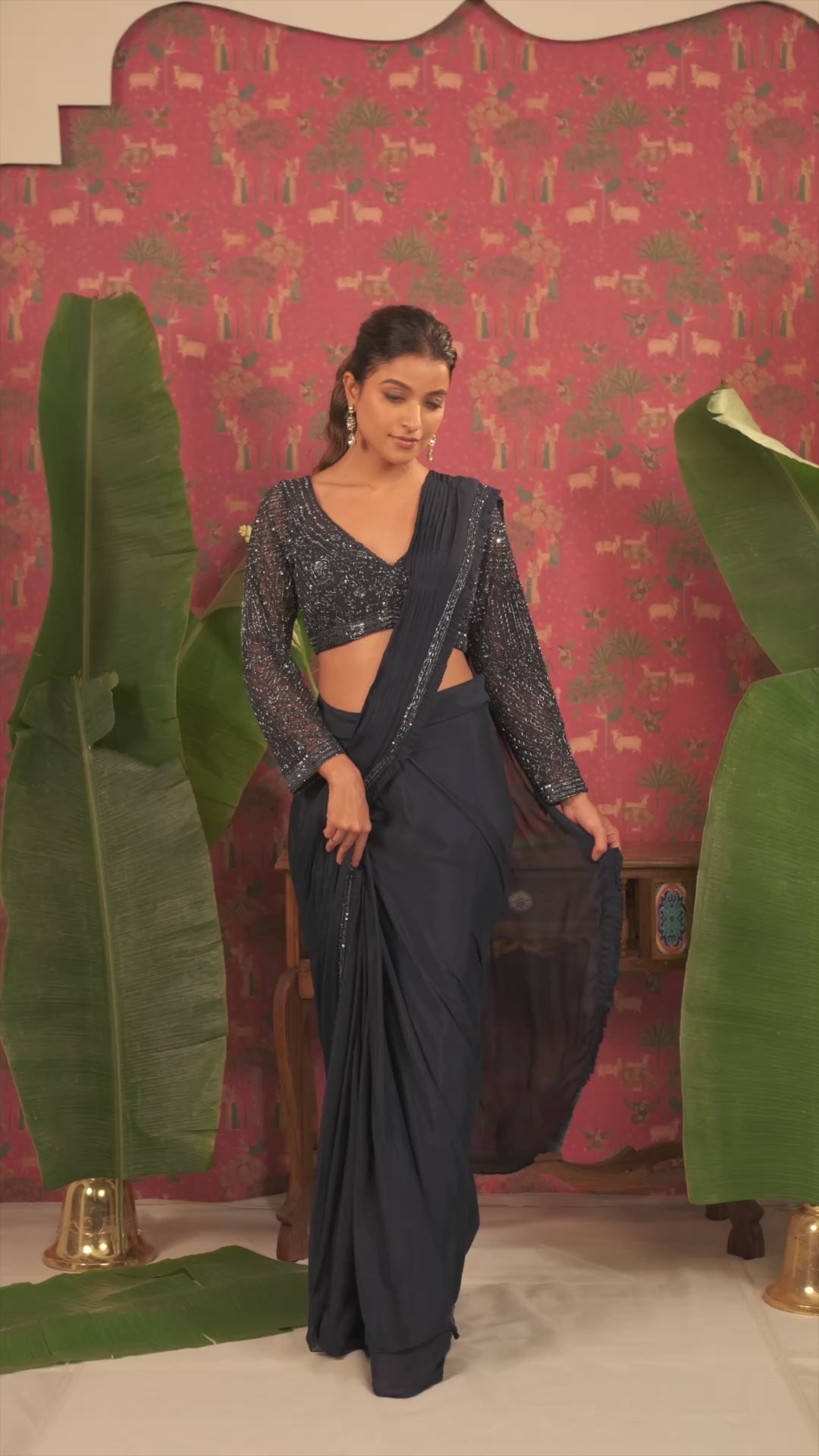Turn heads with our Navy Blue Crepe Silk Pre-Draped Saree. Designed for effortless sophistication, this modern silhouette is embellished with intricate moti, cutdana, and sequin work that lends a subtle shimmer to its deep navy hue. Paired with a matching embellished blouse, the saree blends tradition with contemporary charm, making it a perfect choice for cocktail nights, receptions, and festive celebrations.