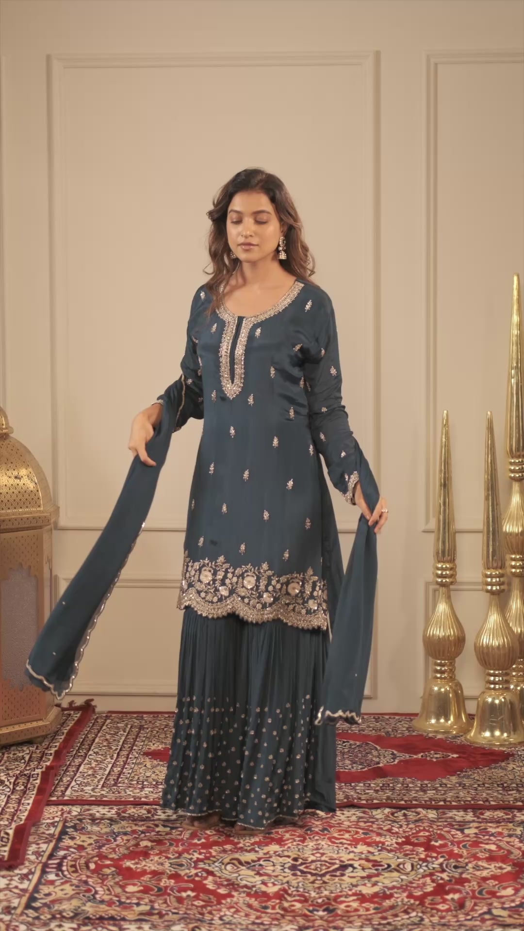 Embrace timeless charm in our Navy Blue Silk Suit Set. The kurta is intricately embellished with delicate cutdana, sequins, and fine embroidery, highlighting its rich silk base. Paired with a matching palazzo and a coordinated navy blue silk dupatta completes the look, making it a perfect choice for festive occasions, wedding gatherings, and elegant evening celebrations.