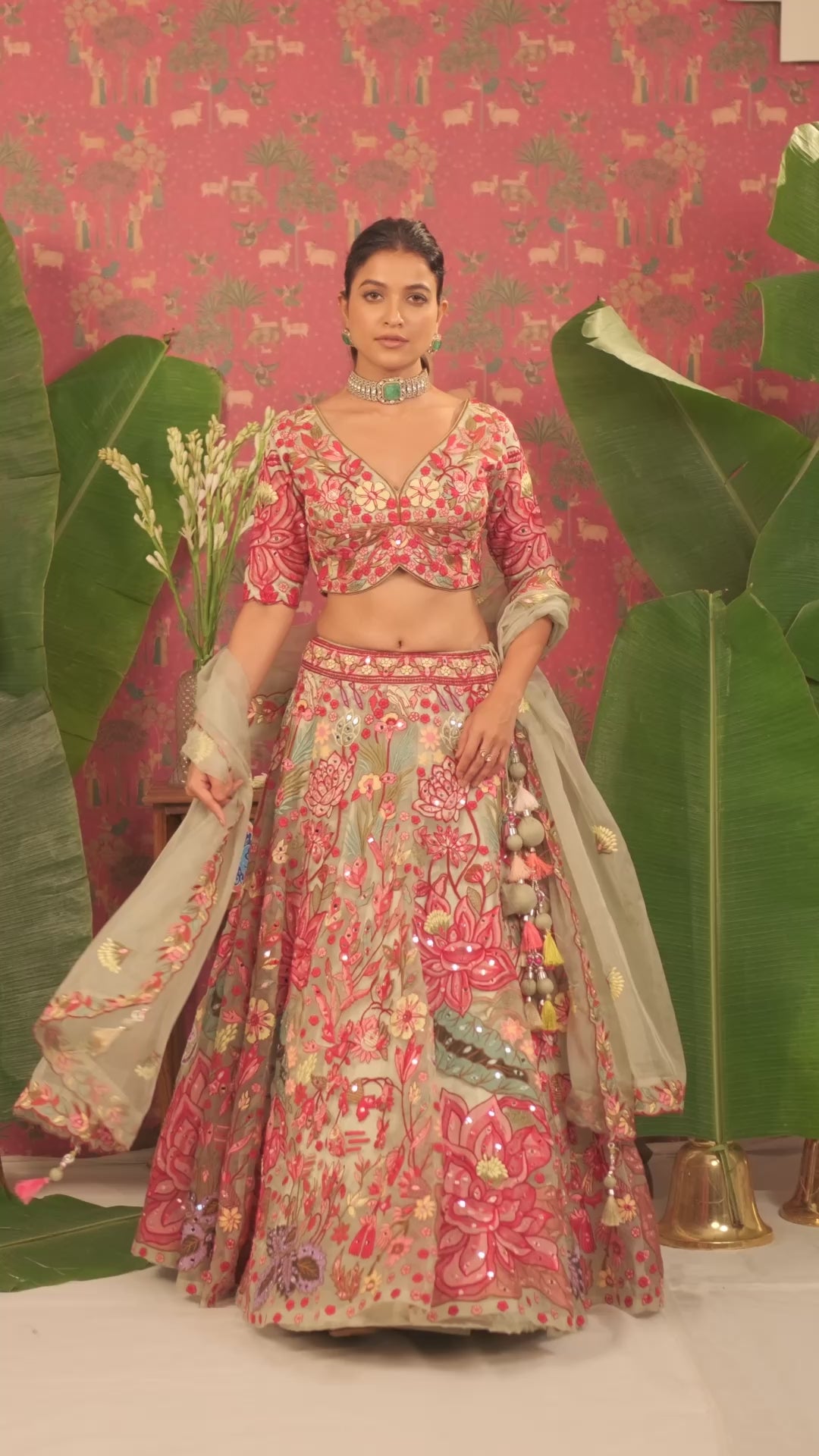 Step into ethereal elegance with our Pista Green Organza Lehenga Set. The lehenga is lavishly adorned with mirror accents and intricate resham embroidery, showcasing vibrant floral and nature-inspired motifs in striking hues. The matching organza blouse mirrors the same exquisite craftsmanship, while the pista green dupatta, delicately finished with embroidered borders, adds a graceful charm. Perfect for weddings and festive celebrations, this ensemble is a true statement of artistry and tradition.