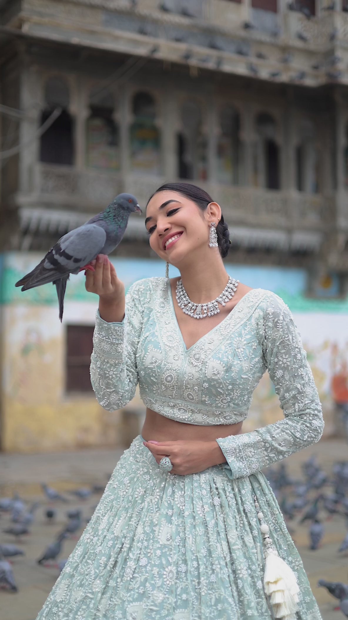 POWDER BLUE GEORGETTE LEHENGA CHOLI WITH CUTDANA AND RESHAM EMBROIDERY