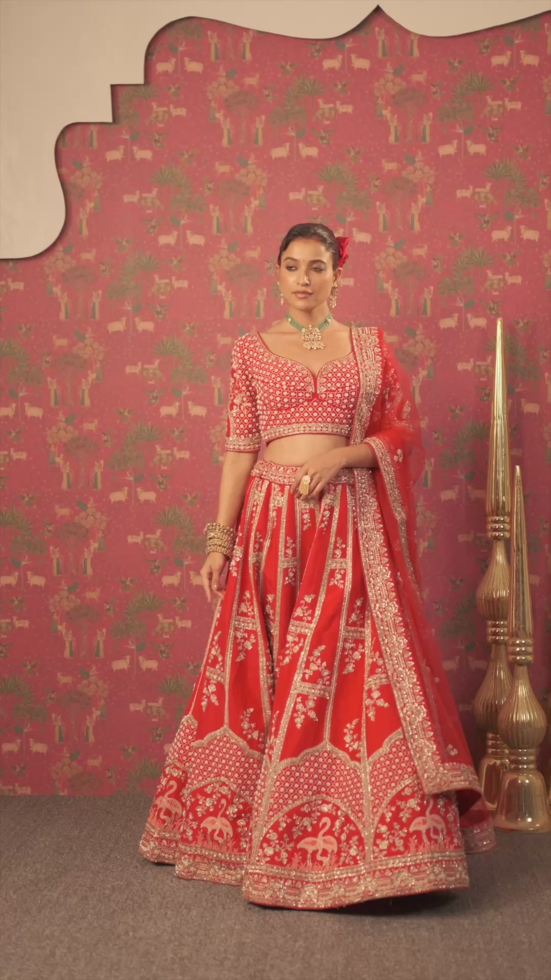 Make your big day unforgettable with the Red Silk Bridal Lehenga Choli Set. Crafted in luxurious silk, the lehenga showcases flamingo motifs and floral patterns with exquisite handwork featuring cutdana, sequins, pearls, and intricate embroidery. The matching silk blouse, highlighted with sequins and delicate threadwork, perfectly complements the grandeur of the lehenga. Completing the ensemble is a soft red net dupatta, adding a graceful and ethereal touch to the look.