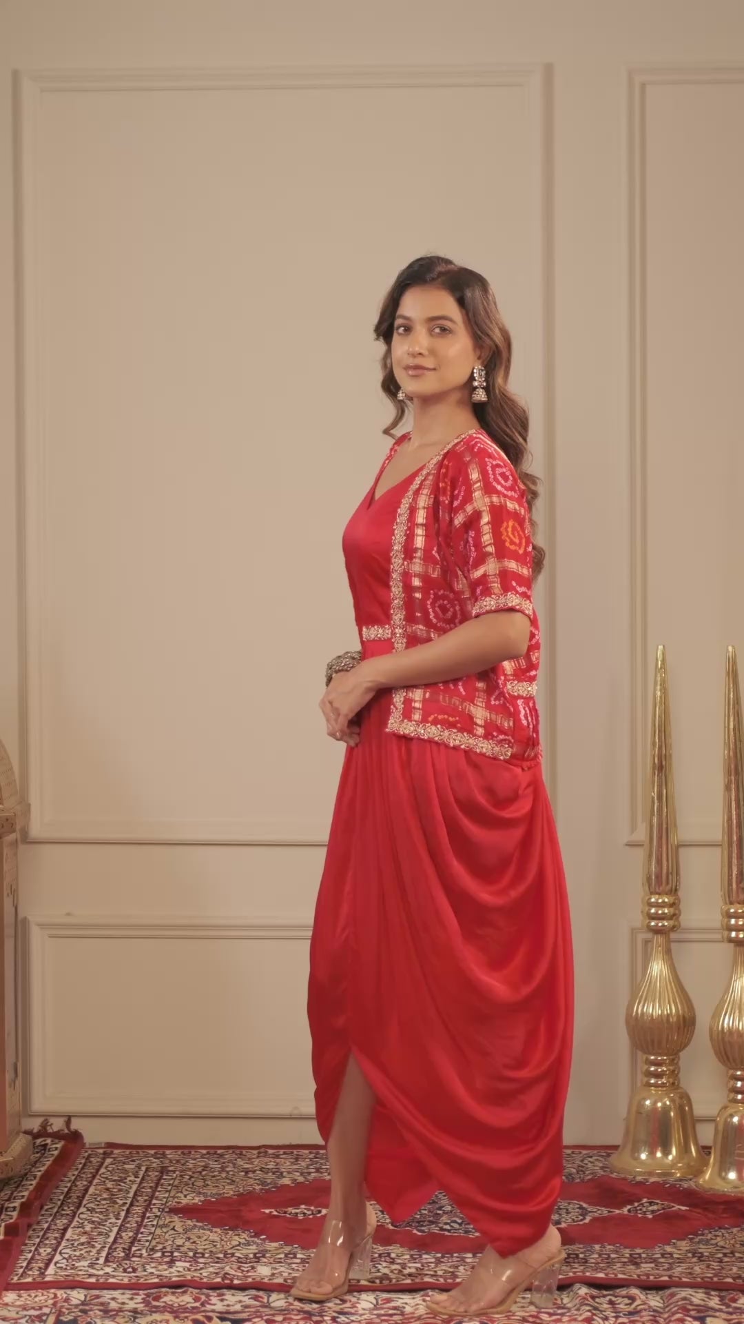 Step into contemporary elegance with our Red Silk Indo Western set. The ensemble features a sleek dress with dhoti-style, creating a modern yet graceful silhouette. A matching jacket, intricately adorned with rich zardosi work, adds a regal touch and elevates the look. Perfect for festive celebrations and family functions.