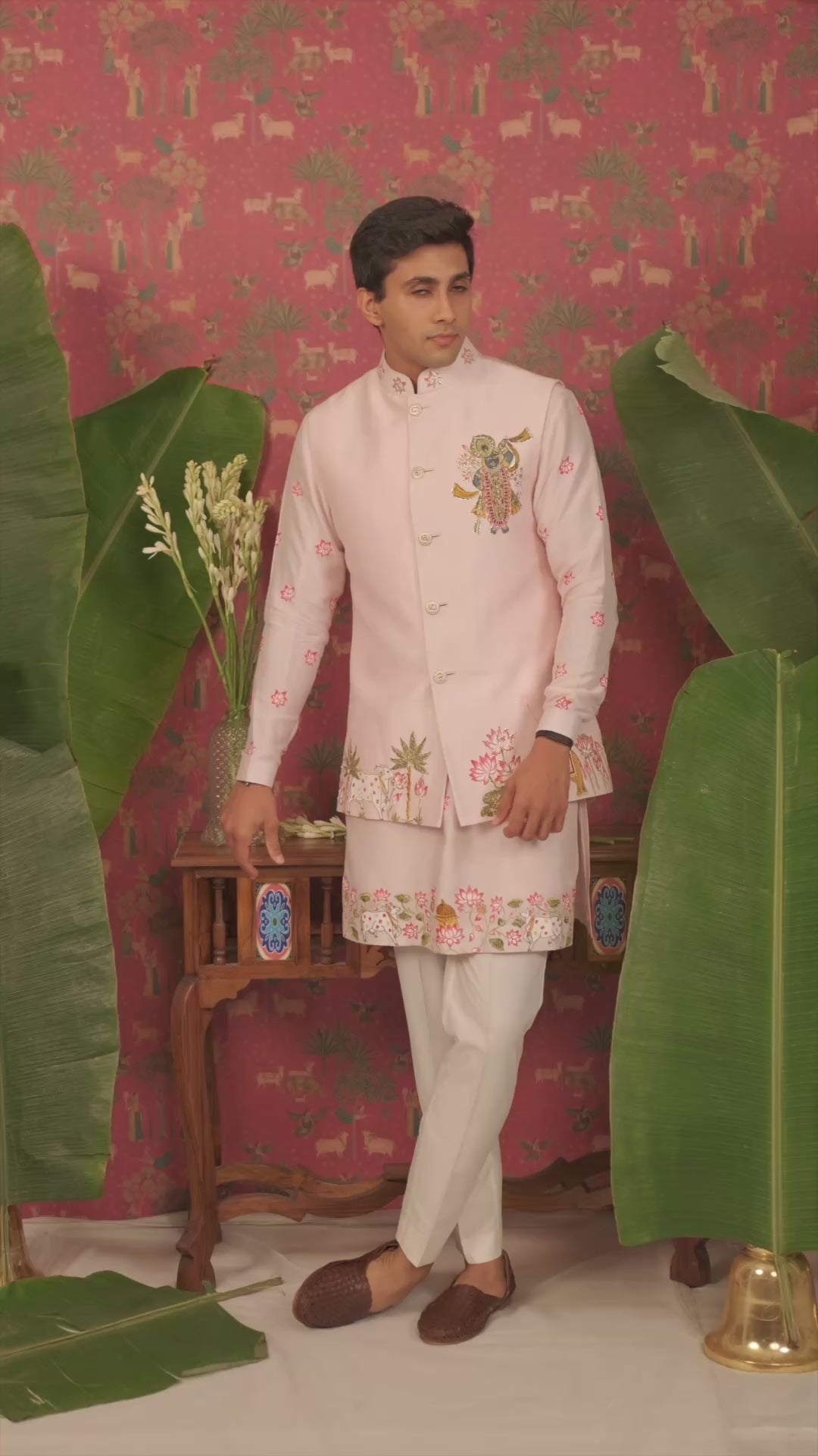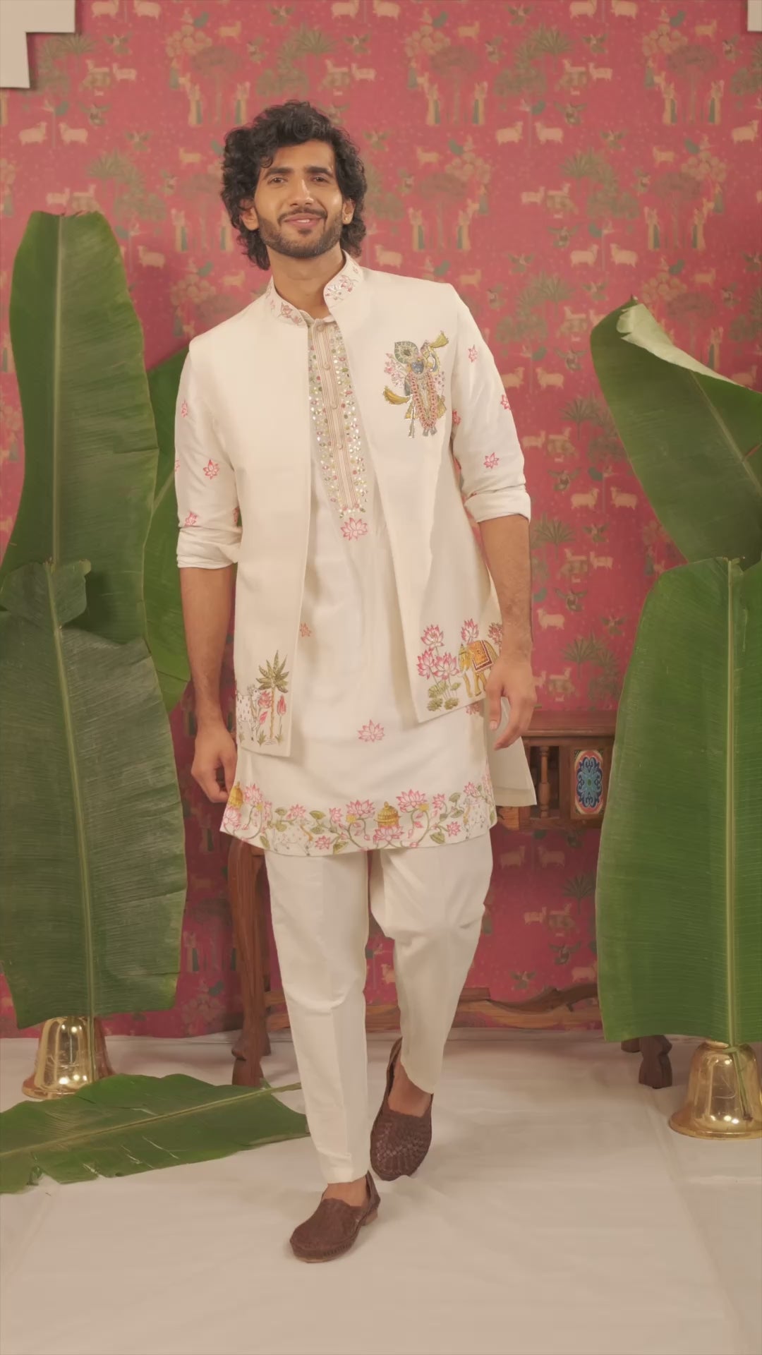 Indulge in refined elegance with this Ivory/Pink Silk Koti Set. The kurta is delicately adorned with hand-painted details, highlighted by pearl, pita, and zardozi work. Layered with a statement koti showcasing a hand-painted Shreenathji motif and nature-inspired designs crafted in fine resham embroidery, the ensemble is paired with matching pants for a truly divine and sophisticated look.